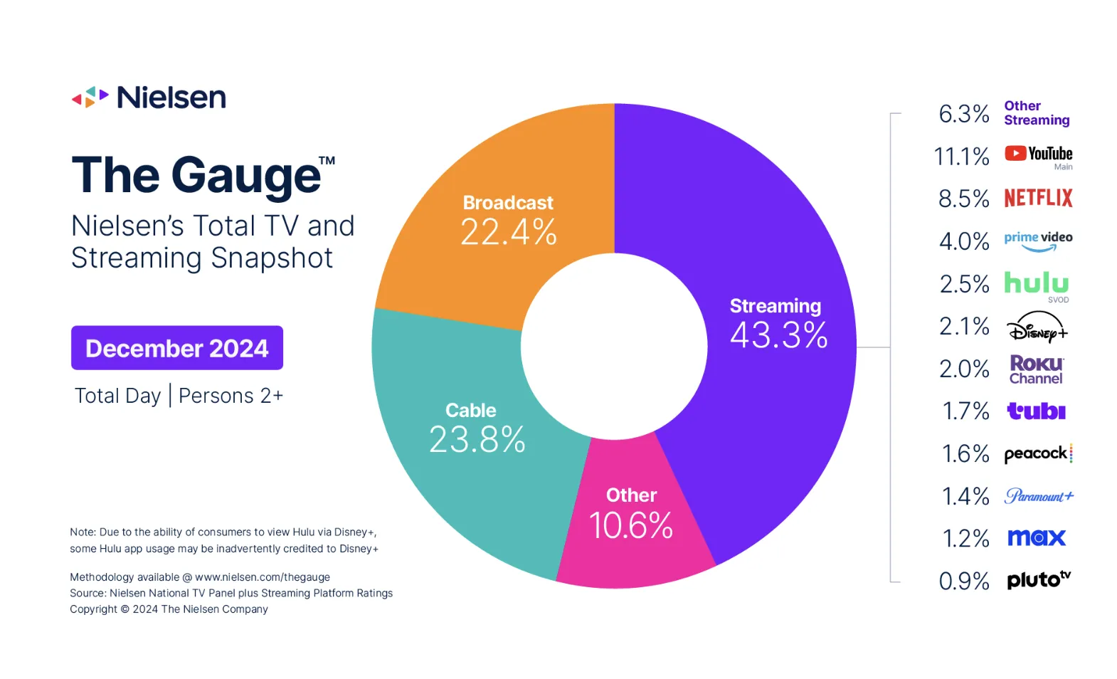 看看最新一期的 尼尔森的 The Gauge。YouTube、Netflix、亚马逊和Roku现在占所有电视观看的四分之一。
