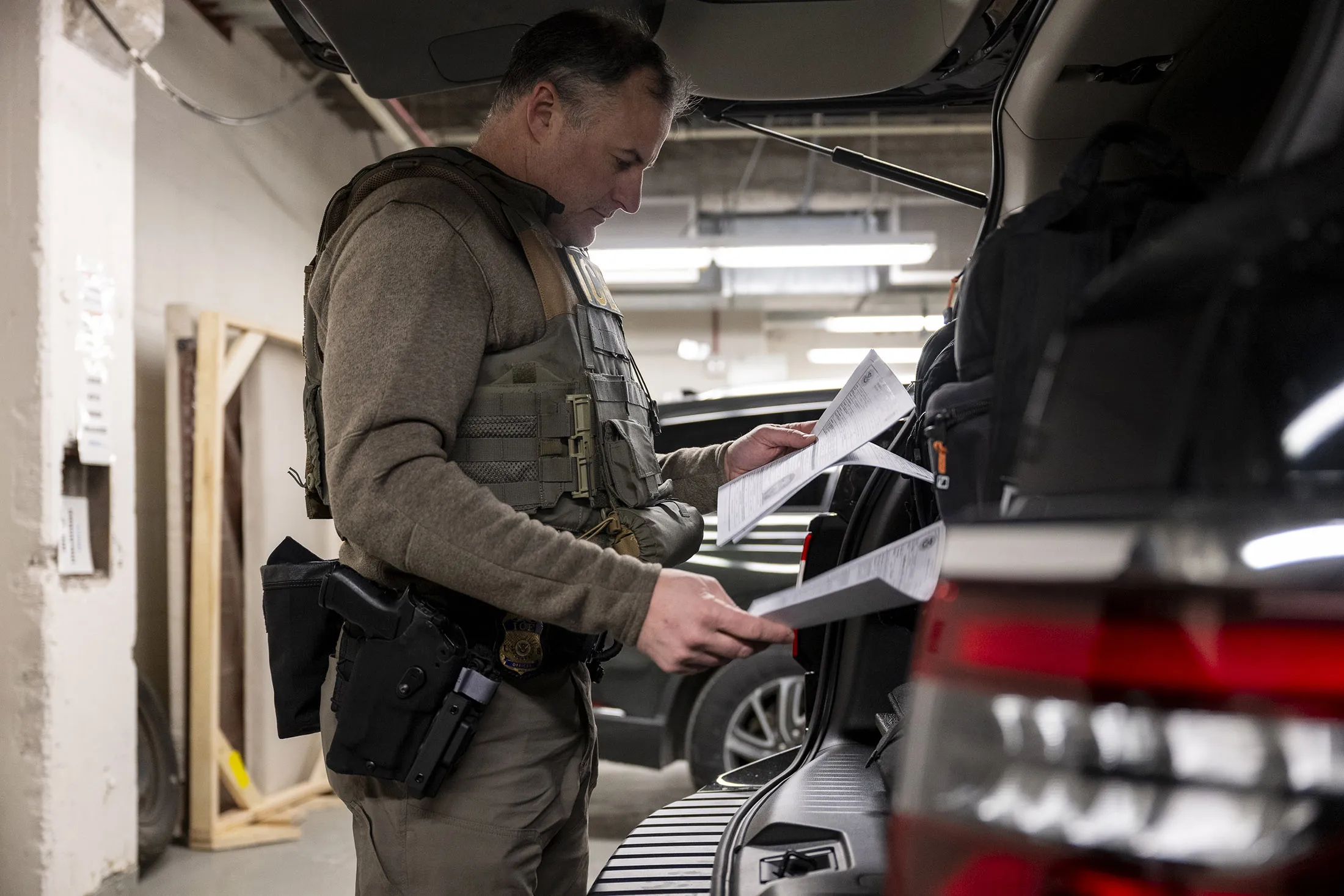 代理现场主任马修·普特拉在芝加哥的执法前会议上做准备。摄影师:克里斯托弗·迪尔茨/彭博社