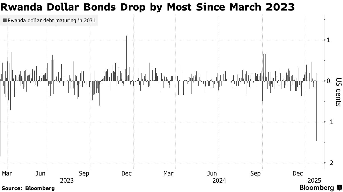 卢旺达的2031年债券价格下跌超过一美分,创下自2023年3月以来的最糟糕表现,交易价格约为84.3美分,因刚果外交部长特蕾莎·凯基万巴·瓦格纳在联合国安理会表示,卢旺达军队正在靠近戈马的边境越境,她的国家认为基加利对M23进攻的支持是“宣战”。