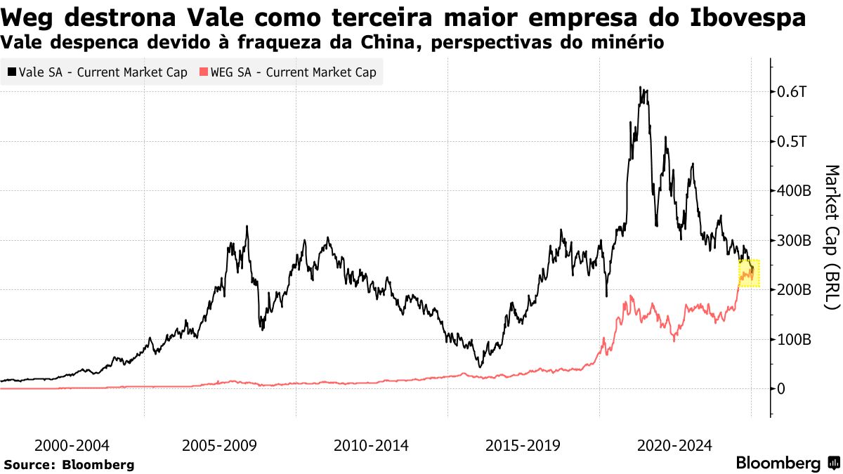 上周四,该公司失去了作为公开上市公司市值第三大的地位,转而被 Weg 取代,后者是全球电气和工业设备制造商。Weg的股票在过去12个月中上涨了72%,而淡水河谷的股票则下跌了24%。