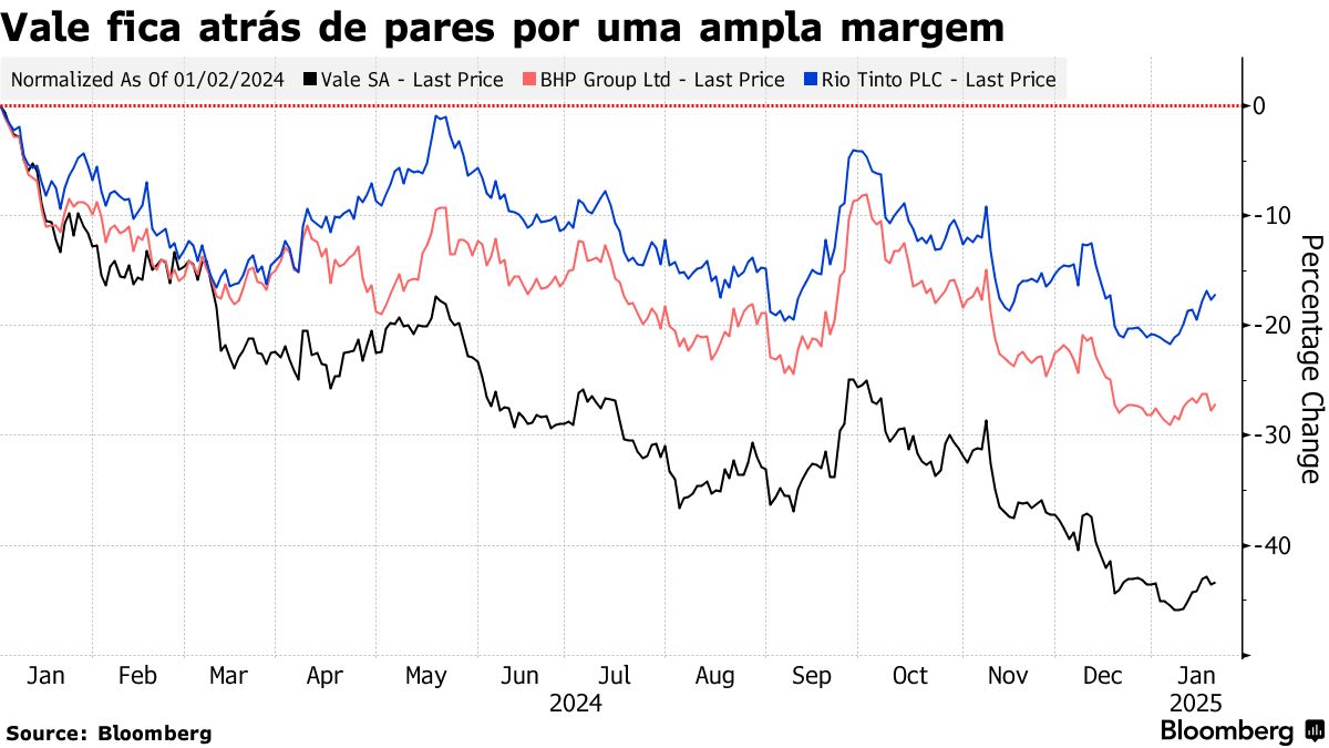 中国房地产行业的持续危机及其对铁矿石的影响——铁矿石约占淡水河谷收入的80%——促使投资者在去年削减了对这家巴西公司的投资。这使得淡水河谷的股票跌至自2020年以来的最低水平,2024年市值蒸发超过1000亿雷亚尔。