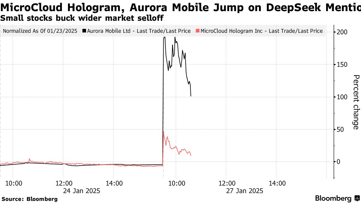 Aurora Mobile Ltd的ADR周一盘中飙升创纪录的229%,达到自2022年11月以来的最高点,此前该公司表示已将DeepSeek的R1大型语言模型整合到其人工智能平台中。MicroCloud Hologram Inc.的股价也上涨了67%,因为该公司同样表示将使用这家中国公司的技术作为其全息AI应用的基础。两者在盘中都回落了一些涨幅。