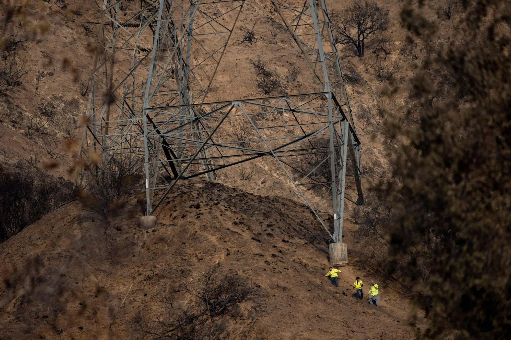 加利福尼亚州帕萨迪纳市伊顿峡谷的南加州爱迪生公司电力传输线路,拍摄于1月16日,背景是伊顿火灾。