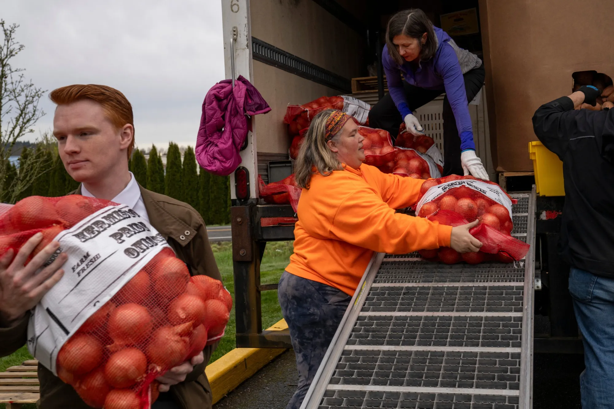 志愿者为在雷德蒙德举行的自取新鲜食品分发活动卸货。