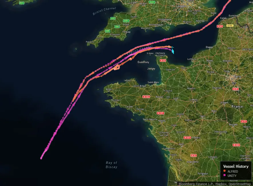 两艘运送俄罗斯原油的油轮于2025年1月24日在比斯开湾掉头。Unity号一直在发出前往印度的信号。当地代表表示,它停靠在一个为船只避风而指定的区域,以应对近期的不利天气条件。追踪显示,Alfred号正前往土耳其。