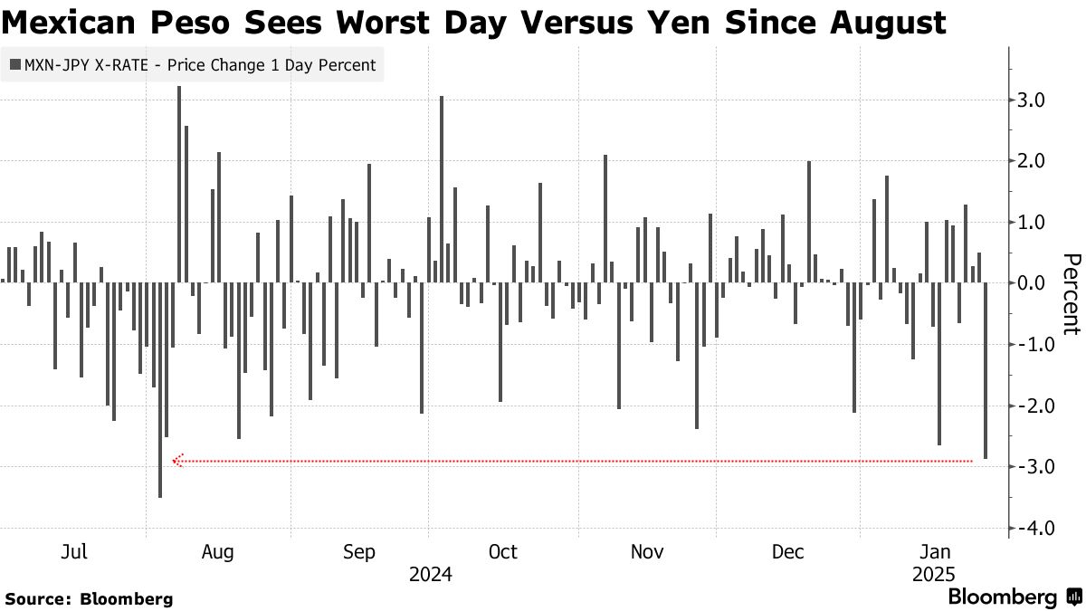 比索对日元的日内最大跌幅自八月以来首次出现,当时一次套利交易的 崩溃扰乱了全球市场。截止纽约时间下午4:30,MXN/JPY交易下跌2.9%,交易员在AI相关股票下滑后削减风险,此前中国DeepSeek推出的新聊天机器人 引发了对高估值的质疑。