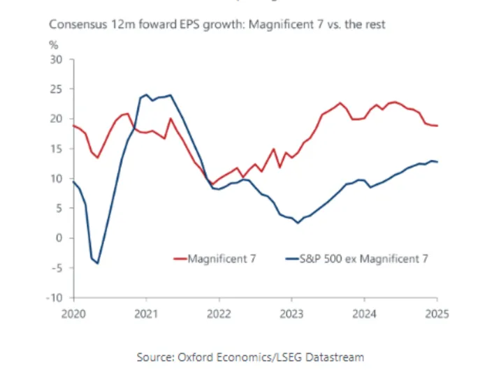 七大巨头不再是美国收益的唯一驱动力,因为在过去几个季度,EPS增长明显扩大。我们认为这一趋势将继续,受到强劲消费者支出和制造业复苏的支撑,并预计这将支持小型股和等权重指数的超额表现。