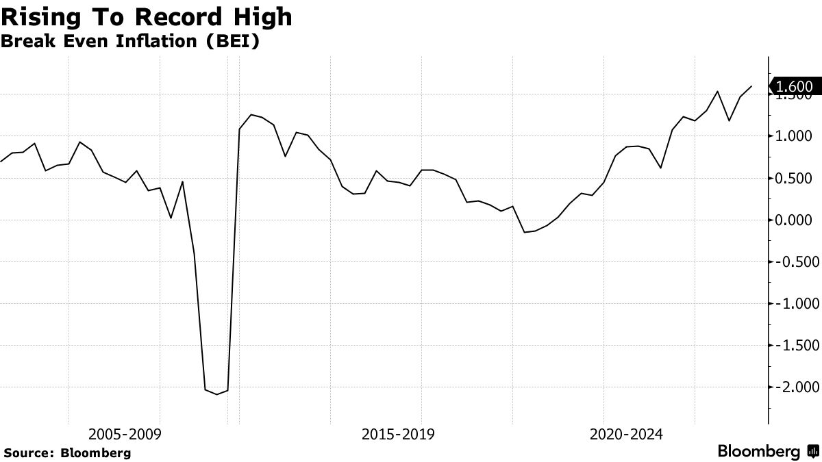 突破性通胀率(BEI)在1月27日超过1.6%的水平,此前日本银行将利率上调至0.5%并上调了价格预测。根据彭博社汇编的数据,BEI是通过从新发行的10年期国债收益率中减去与通胀挂钩的债券收益率计算得出的,周一的水平是自2004年首次发行通胀挂钩债券以来的最高水平。