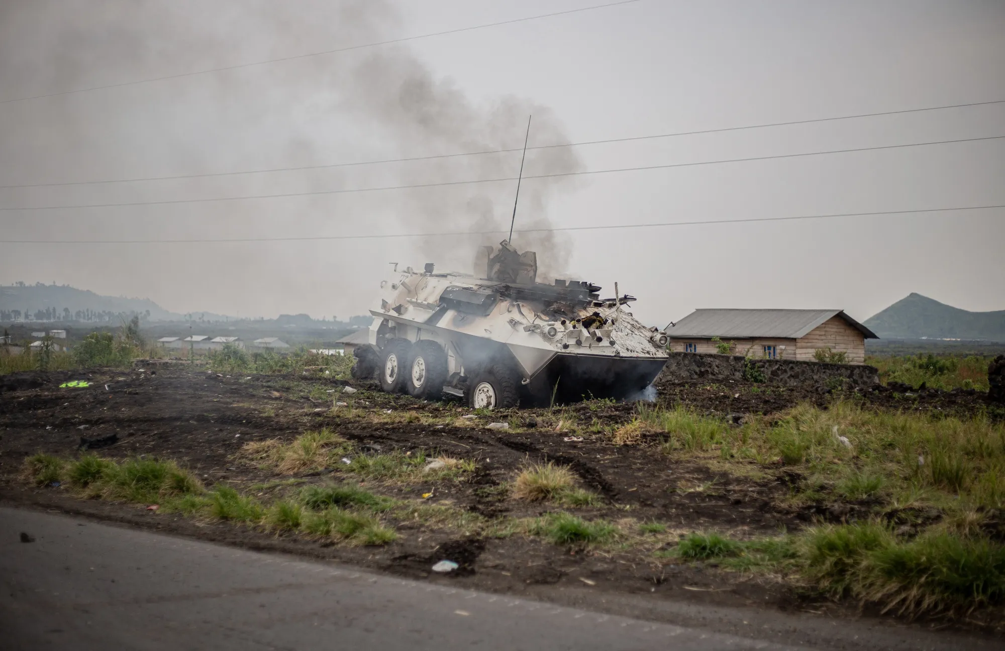 属于联合国东部刚果稳定特派团的装甲运兵车。摄影师:乔斯平·姆维沙/法新社/盖蒂图片社叛军在2012年曾占领戈马,但国际社会对卢旺达的压力迫使他们在一周多后撤回。