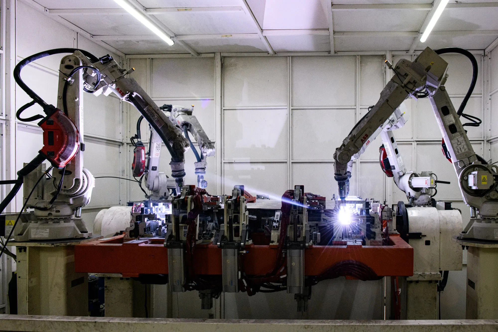 用于焊接的机器人手臂在美国阿拉巴马州穆斯克肖尔斯的Linamar Corp.加拿大电动汽车电池外壳制造设施中操作。