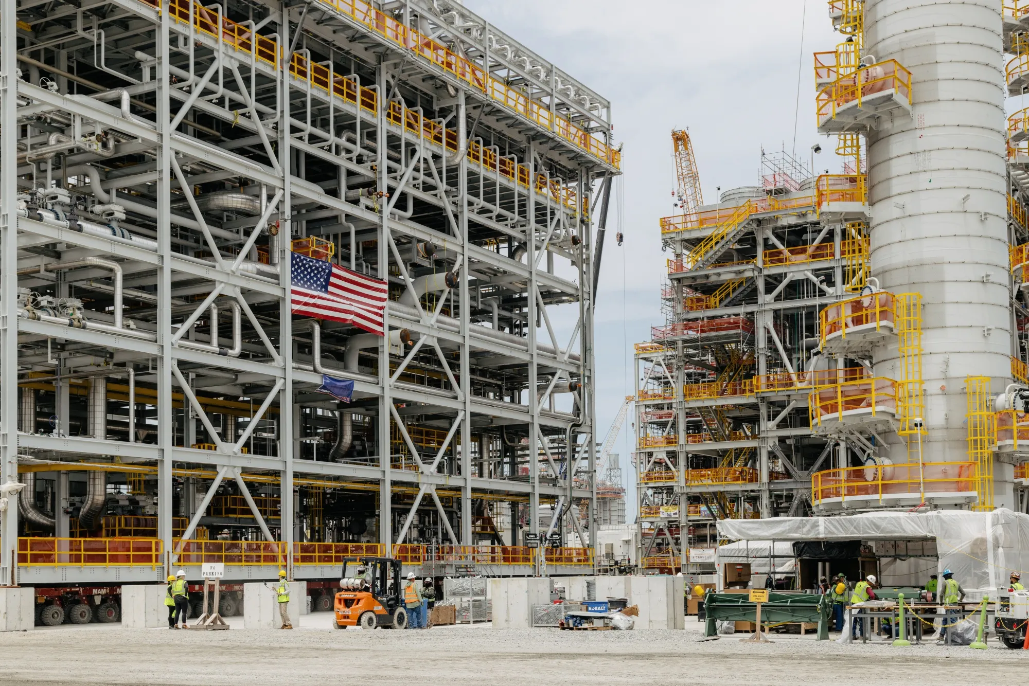一面美国国旗在路易斯安那州硫磺港的Venture Global Plaquemines LNG工厂建设期间悬挂。