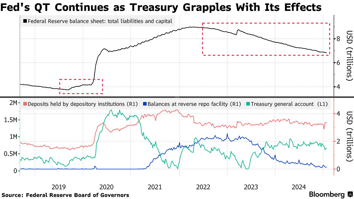 这很重要。这个过程所需的时间越长,银行储备被抽干到稀缺的可能性就越大,从而扰乱美国资金市场。这也增加了提高借贷成本的威胁,因为市场在努力寻找买家以购买为资助不断膨胀的预算赤字而发行的新政府债务。