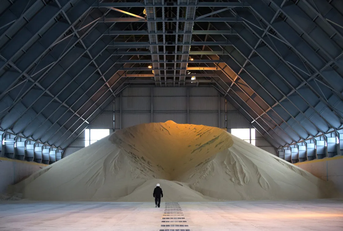 一名工人走向俄罗斯切列波韦茨一家肥料厂内的大量磷肥堆。