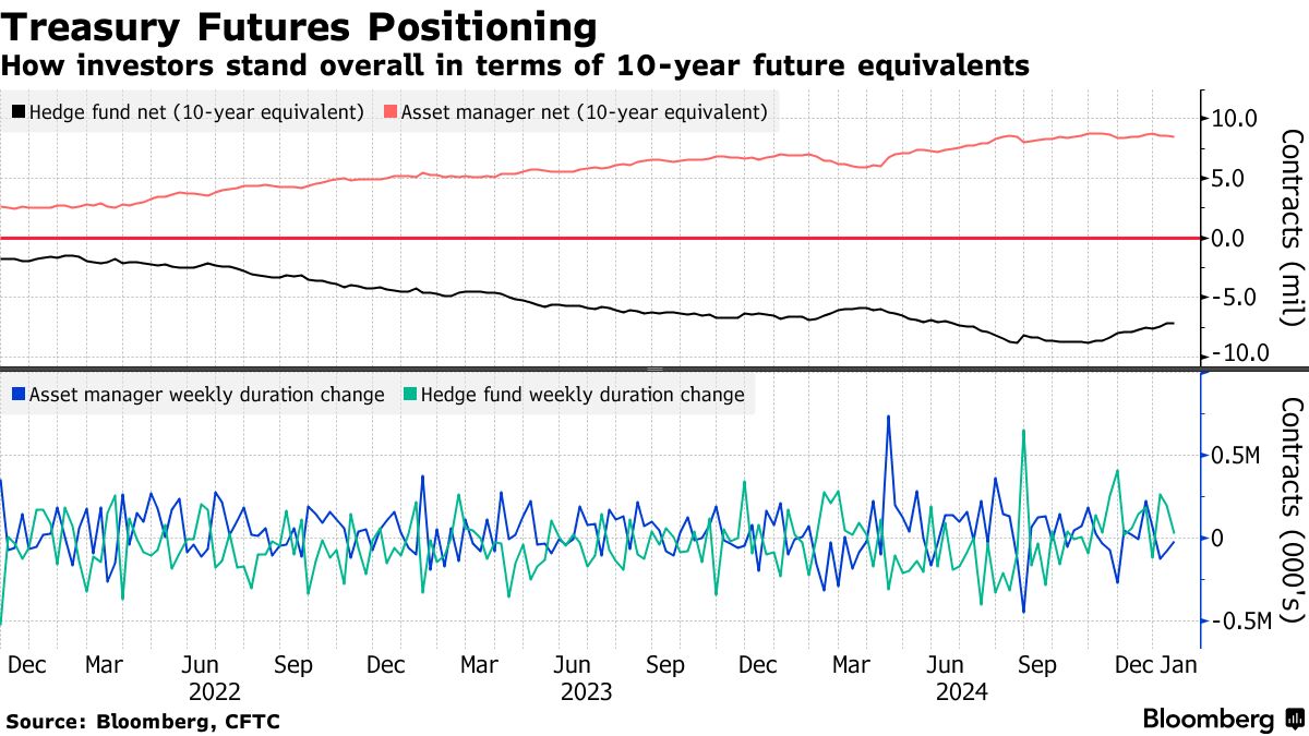 根据截至1月21日的CFTC数据,对冲基金延长了净空在SOFR和10年期国债期货中的持仓,总风险金额接近1000万美元/DV01。然而,在这一周内,对冲基金的净久期变化接近于平坦,因为在曲线的长期端进行了短期回补。另一方面,资产管理公司连续第三周小幅减持净久期多头。