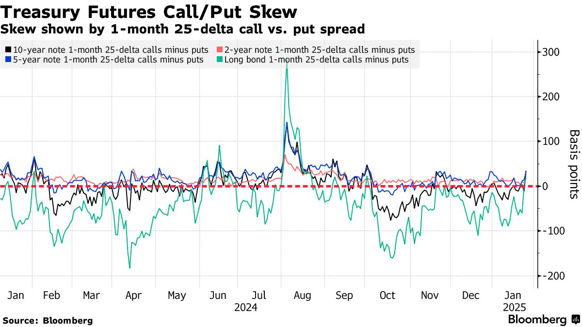 国债对冲的溢价首次转向看涨期权,超过看跌期权,自去年年底以来的首次变化,转变的主要发生在周一的急剧避险潮中。对更大债券反弹的保护偏好在最近的资金流动中也有所体现,其中一笔成本约7200万美元的交易出现,旨在对冲未来几周的低收益率。