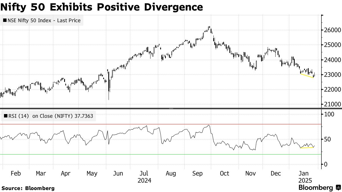 周二,牛市找到了一些喘息之机,因为 印度储备银行的流动性注入 提高了降息的希望,推动了股票的反弹。现在还为时尚早,无法判断更广泛的抛售是否接近尾声,或者反弹是否仅仅是暂时的停顿。不过,技术指标显示出潜在的支撑。14天相对强弱指数(RSI)显示出正向背离——尽管价格创下了更低的低点,但RSI却形成了更高的高点。此外,日线图上的十字星形态表明,卖压可能暂时减轻。不过,很多事情将取决于周六的联邦预算将带来什么。
