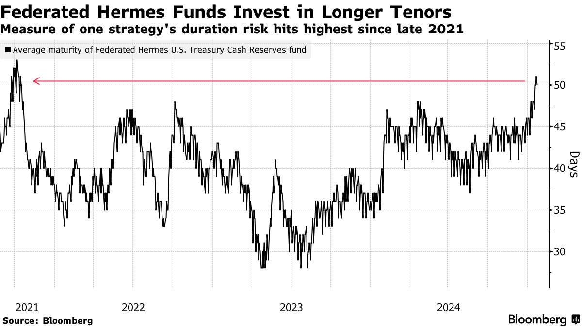 坎宁安的定位可以在630亿美元的 联邦哈梅斯美国国债现金储备 基金中看到,该基金在过去两年中几乎翻了一番,增长速度超过了更广泛的市场。根据彭博社汇编的数据,上周,其平均到期时间首次达到50天,自2021年底以来首次达到这一水平。公司在可承担的期限风险方面受到法规和客户委托的限制。