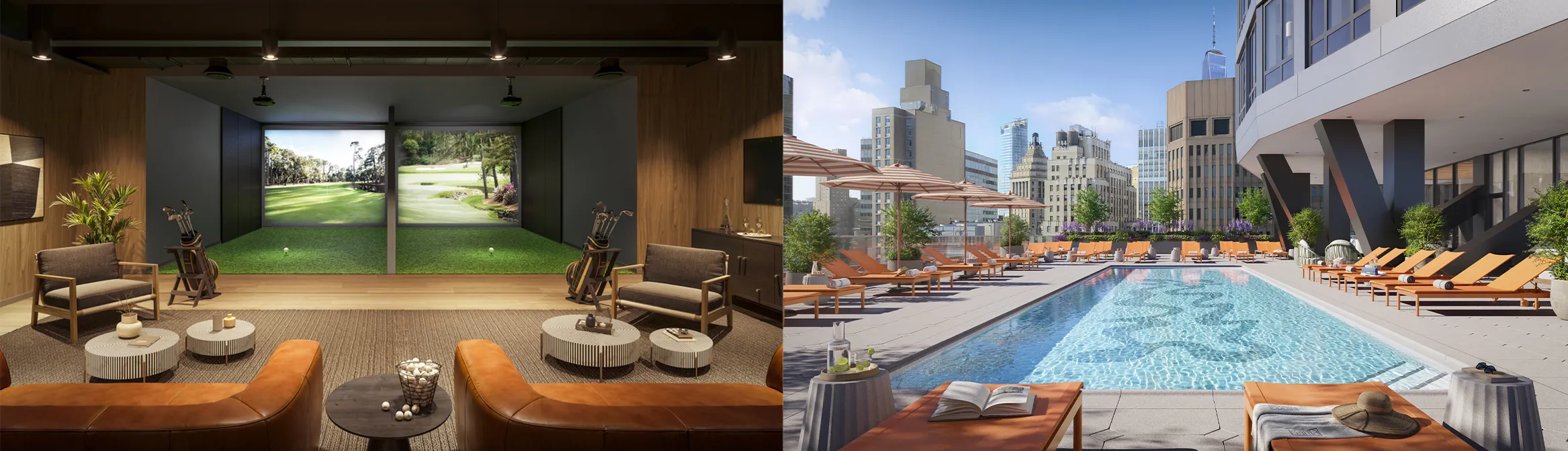 25号水街高尔夫模拟器和屋顶游泳池的效果图。来源:Streetsense距离电池公园两个街区,距离主要地铁线路四个街区,转角就是FDR大道,这栋建筑——重新命名为南曼哈顿的SoMA——位于一条宽阔的街道上,三面都拥有无阻碍的视野。