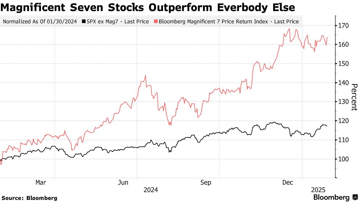 这类似于1990年代末互联网泡沫前的上涨,当时只有一小部分股票超过基准。由于这种集中带来的市场风险本周已显现,因为DeepSeek的冲击抹去了五千亿美元的英伟达公司的市场价值。