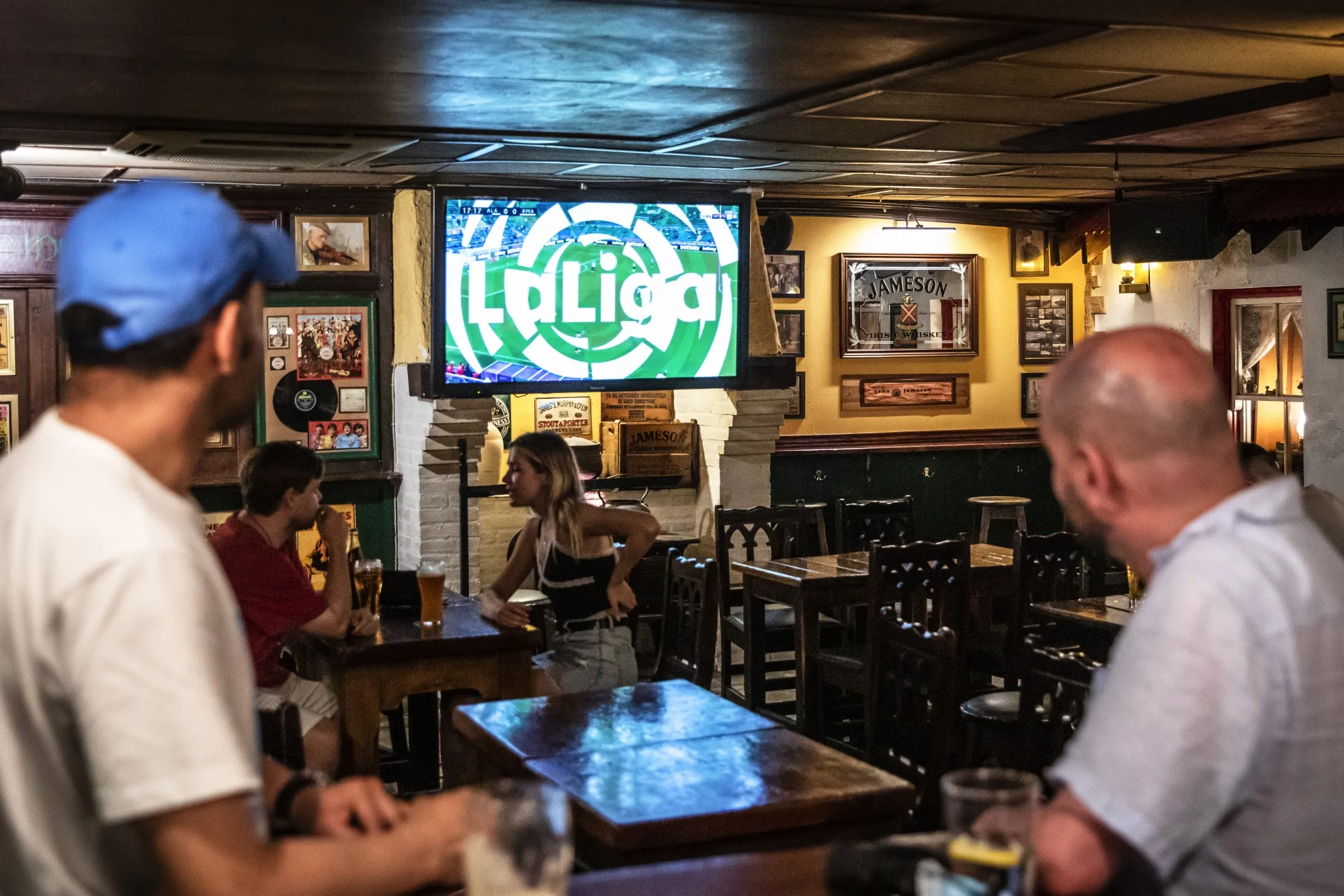 足球迷在西班牙巴塞罗那的一家酒吧观看巴萨与皇家社会的西甲比赛。