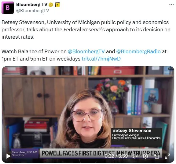 今天在彭博电视台的 权力平衡早间版中,主持人乔·马修和凯莉·莱因兹采访了密歇根大学公共政策与经济学教授贝茜·史蒂文森,讨论了美联储今天关于利率的决定以及潜在关税可能如何影响未来的行动。