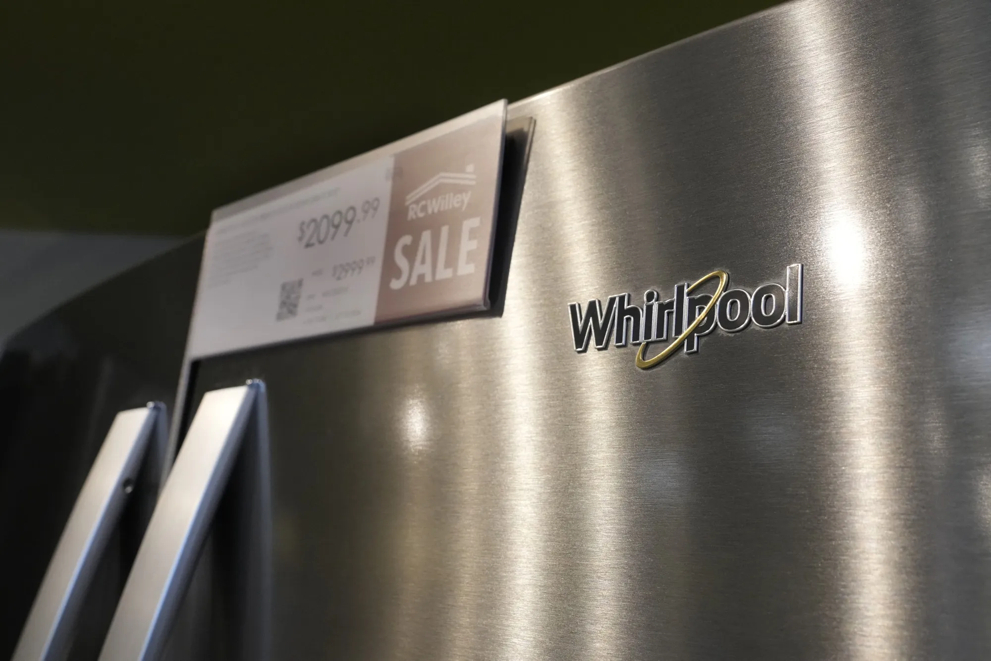 在犹他州奥勒姆的RC Willey家居用品商店里,一台惠而浦冰箱。摄影师:乔治·弗雷/彭博社惠而浦公司的股票在周三大幅下跌,此前该公司报告的季度销售和调整后的收益低于预期,并给出了悲观的2025年展望。