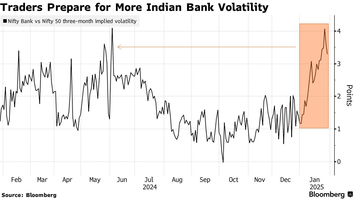 随着印度预算的临近,银行股已成为期权交易者的焦点。对Nifty银行指数波动进行对冲的成本接近自6月选举以来的最高水平。这超过了对Nifty 50指数的类似押注,表明市场对波动性加剧的预期。在过去十年中,Nifty银行指数在预算日的平均波动为1.8%,而Nifty为1.1%。