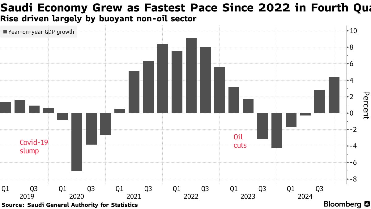 沙特阿拉伯的经济在第四季度以自2022年以来最快的速度增长,因为非石油部门在王国数十亿美元的经济多元化战略下扩张。