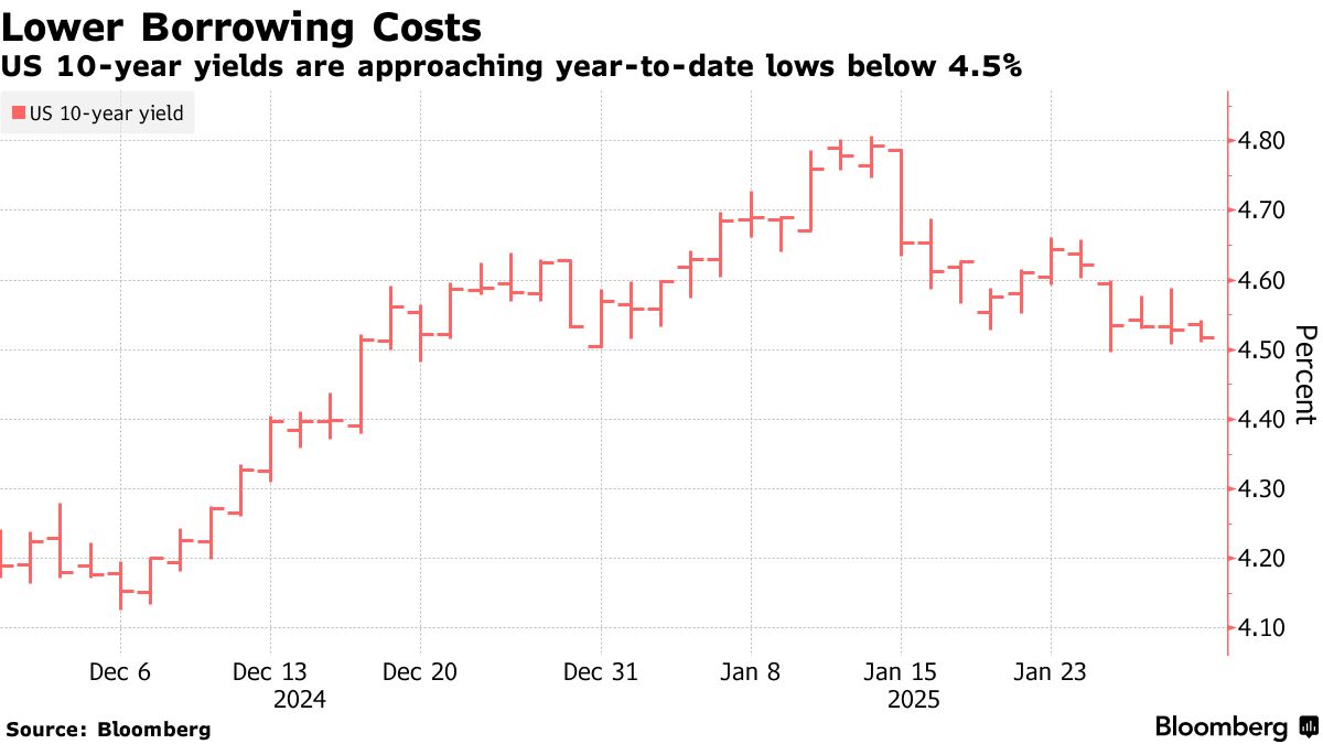欧元区债券在数据显示该地区的两个最大经济体 在去年年底收缩 后大幅上涨,且该地区 意外停滞,因为法国和德国政府的崩溃打击了企业和消费者的信心。德国10年期国债收益率下降了最多六个基点,降至2.53%。