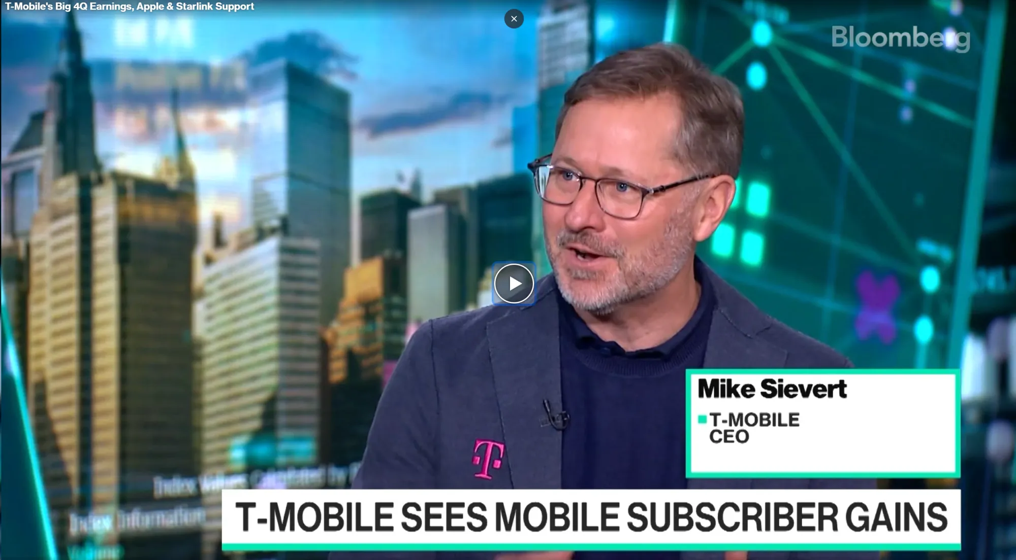 迈克·西弗特,T-Mobile首席执行官,加入 彭博科技讨论公司第四季度的盈利超预期,以及他们如何与苹果秘密合作在iPhone上实施Starlink服务。
