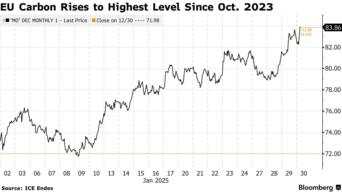 12月份的基准碳期货周四上涨了最多1.9%,达到每公吨84.50欧元,为2023年10月以来的最高点。