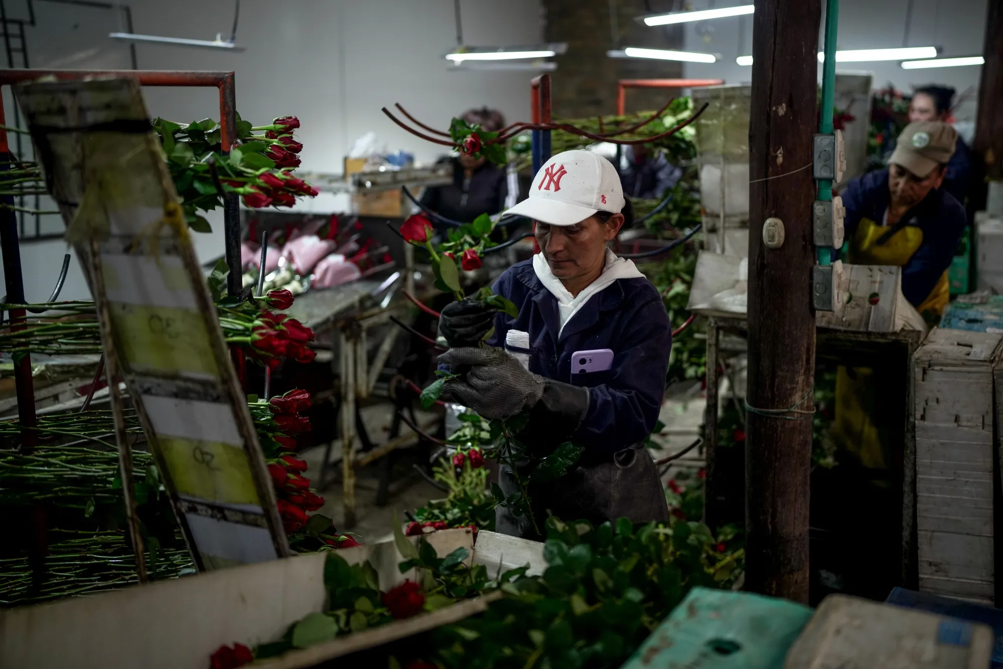 在白色遮阳篷的庇护下,她们用金属网手套擦拭花茎,以去除刺并准备好运输。然后,她们小心翼翼地将情人节红、棉花糖粉红和柠檬黄的花卉用印有心形的透明薄膜包装。