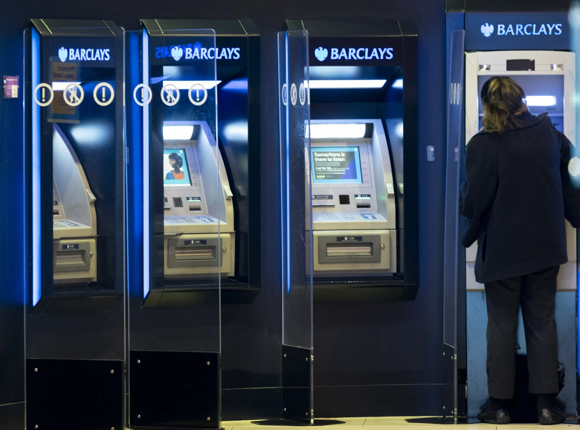 一位客户在伦敦的巴克莱银行分行使用自动取款机。
