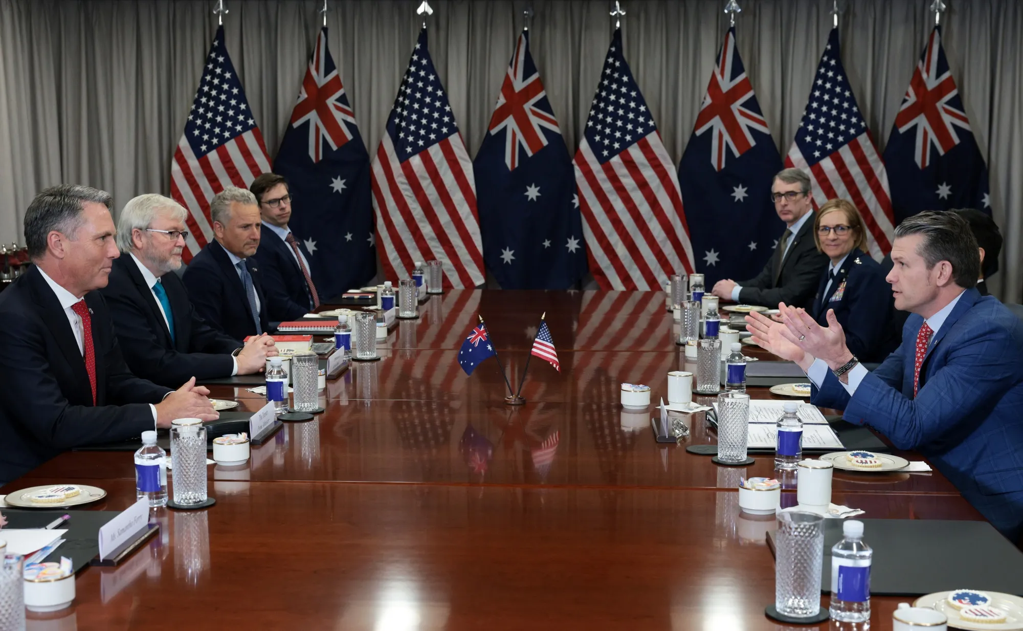2月7日,皮特·赫格塞斯(右)与理查德·马尔斯(左)在五角大楼举行双边会谈。摄影师:亚历克斯·王/盖蒂图片社"就防务而言:军力部署、国防工业基础、联合能力合作以及Aukus协议,都是标志性组成部分,“赫格塞斯在周五于华盛顿会见澳大利亚副总理理查德·马尔斯前的开场白中表示,“澳大利亚是我们全球联盟体系的前沿。”