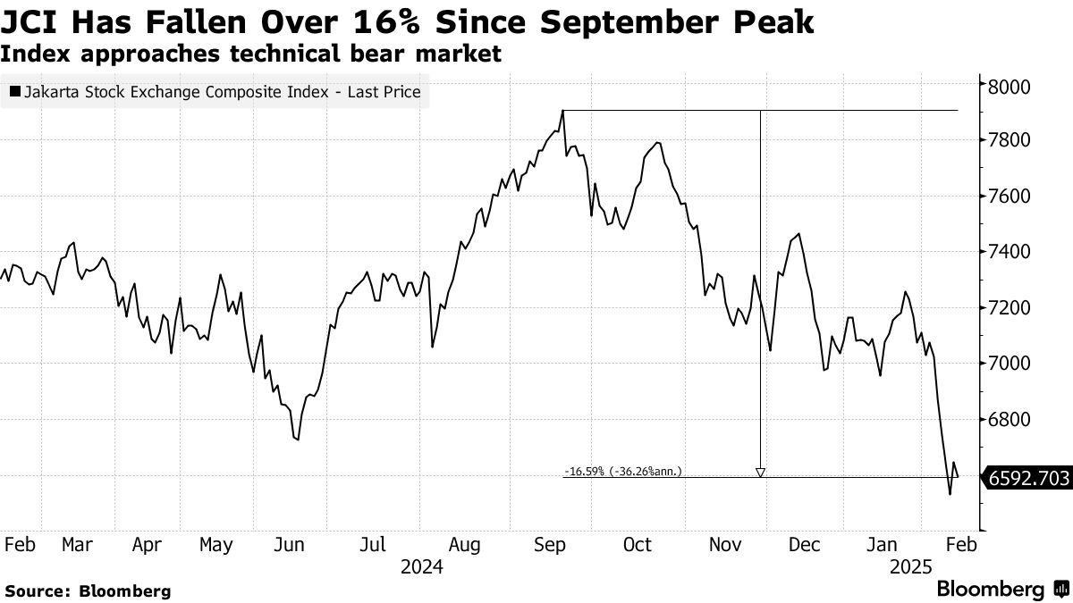雅加达综合指数较去年9月的历史高点下跌逾16%,已接近技术性熊市。全球贸易紧张局势、经济增长停滞以及总统普拉博沃·苏比安托的大规模支出计划都给该指数带来压力。