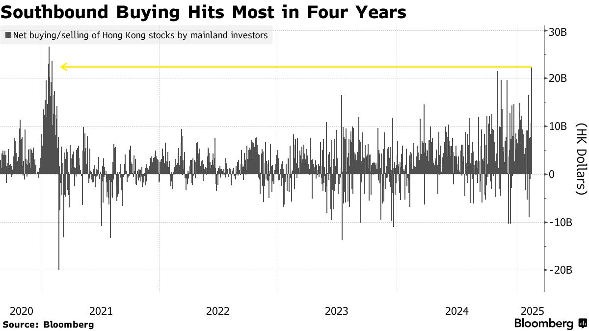 在这波疯狂买入中,他们最青睐的证券是盈富基金,净买入逾90亿港元。尽管这只交易所交易基金出现温和资金外流,但仍有资金流入,表明非内地买家热情不高。