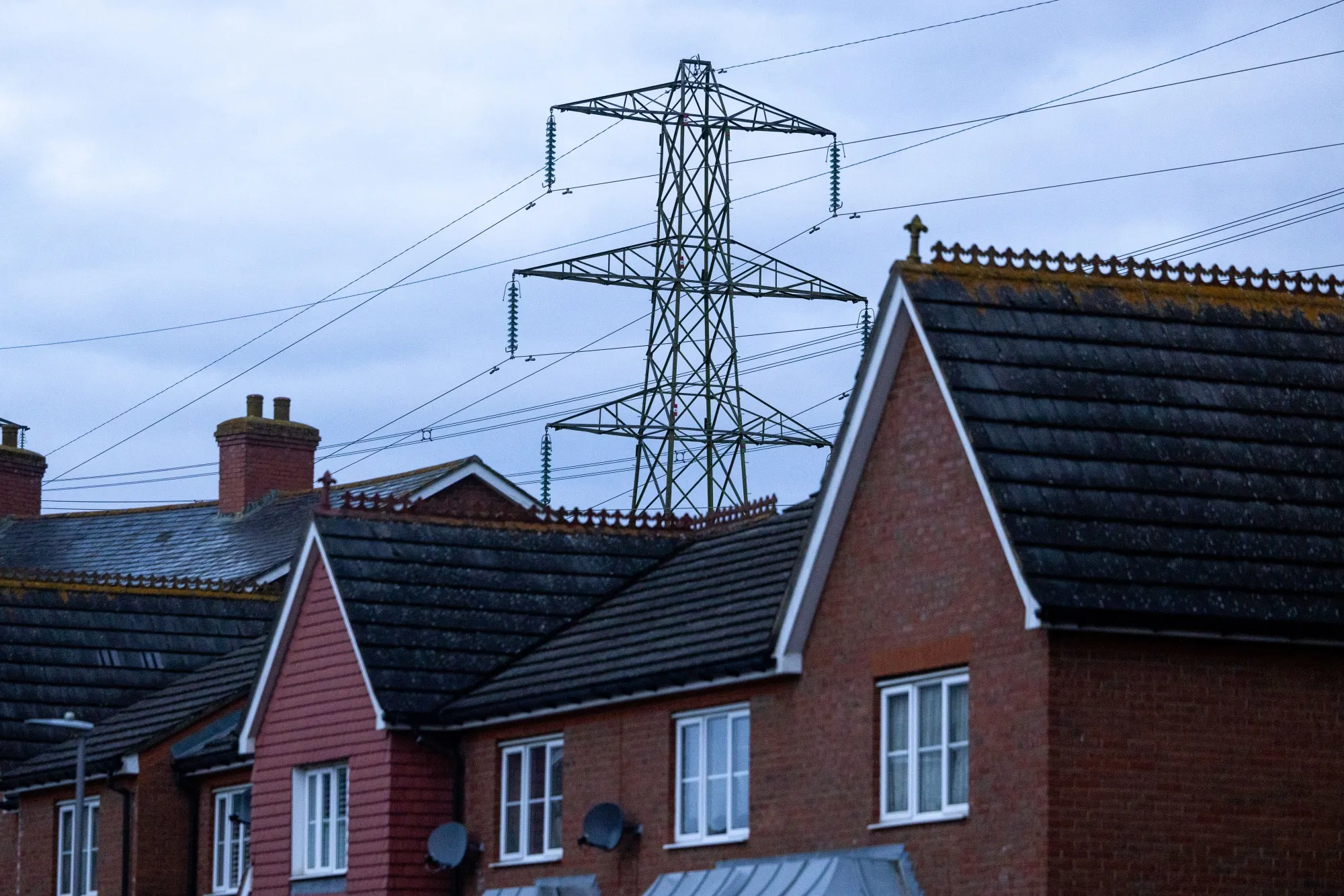 史蒂文尼奇附近住宅区外的一座输电塔。摄影师:克里斯·拉特克利夫/彭博社随着暖锋临近,英国电力价格跌至今年最低水平,供暖需求随之下降。