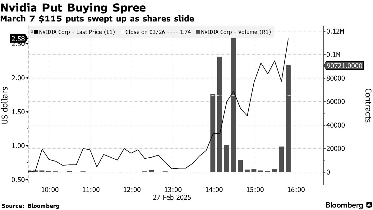 下午2点至2点40分期间,一名交易员买入超过30万份合约,押注英伟达股价将在3月7日前跌至115美元——这意味着较周三收盘价下跌12%。该股上次交易于这一水平还是在9月中旬。