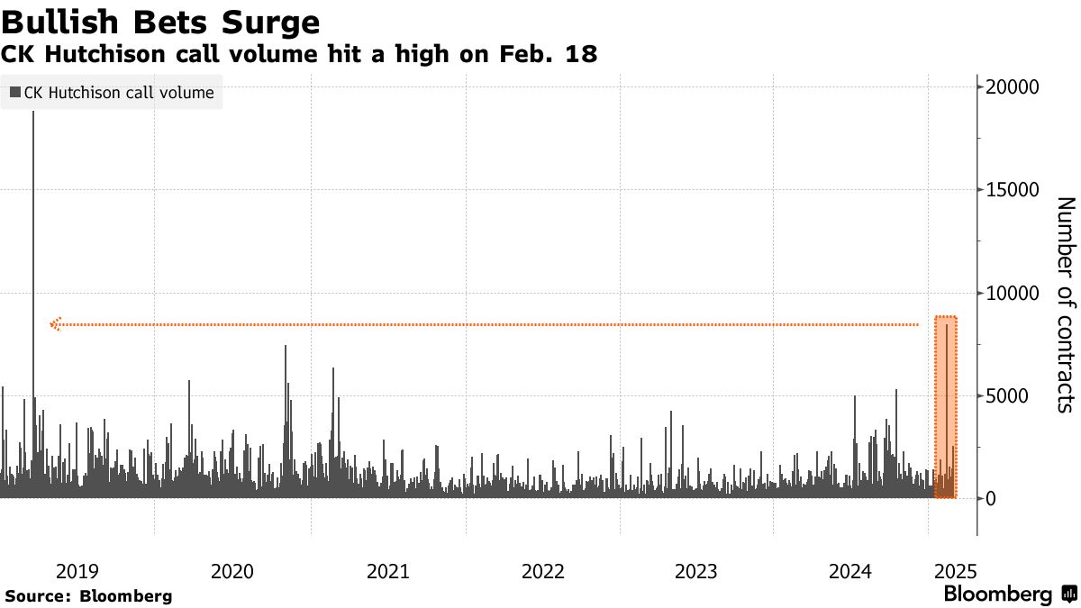 2月18日,超过5,100份行权价为46港元的3月看涨期权以每份3港分的价格成交,此前几周有消息称巴拿马正考虑取消与和记港口PPC的合同。周三,随着股权出售消息公布后股价上涨22%,这些期权价格一度飙升35,800%——从1港分涨至3.59港元,为亿万富翁李嘉诚创立的这家企业集团带来超过190亿美元的现金。