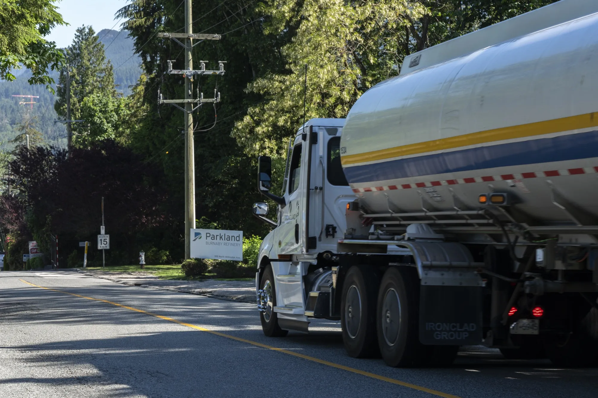 一辆卡车驶过不列颠哥伦比亚省帕克兰的伯纳比炼油厂。
