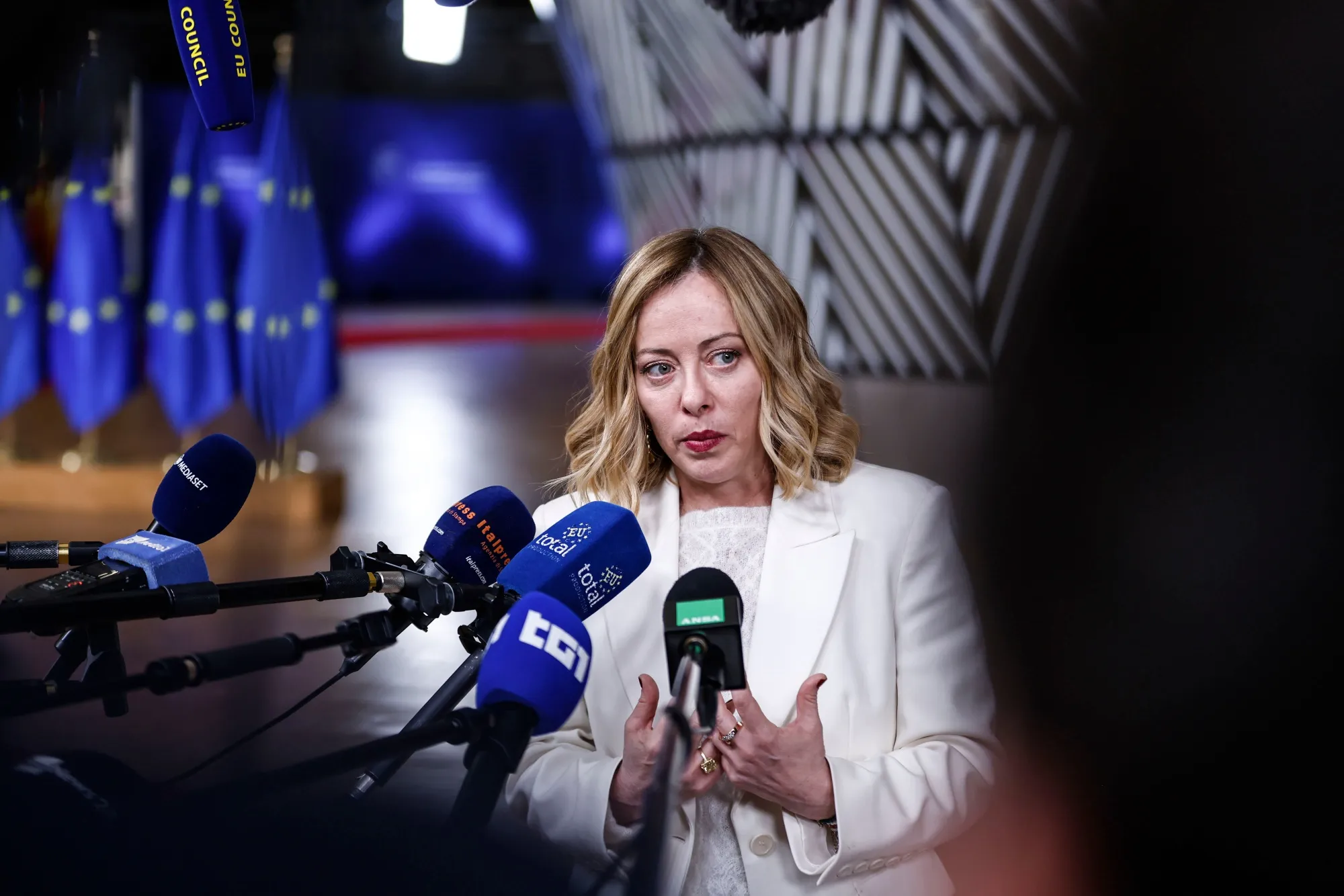 3月6日,乔治娅·梅洛尼在布鲁塞尔参加完特别欧洲理事会会议后。