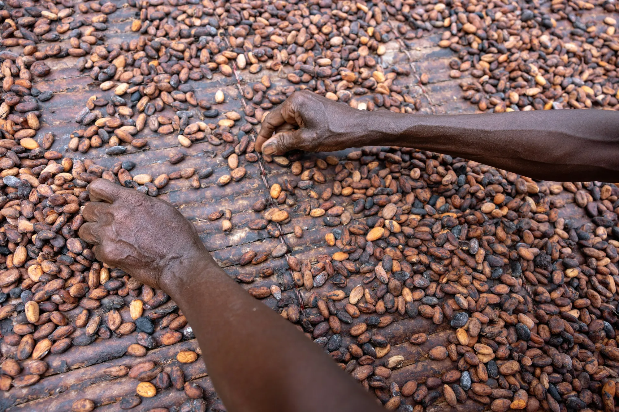 加纳夸本农场,一名农民正在摊开可可豆晾晒。