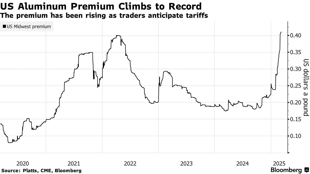 特朗普对加拿大加征关税 美国铝溢价创下历史新高——彭博社