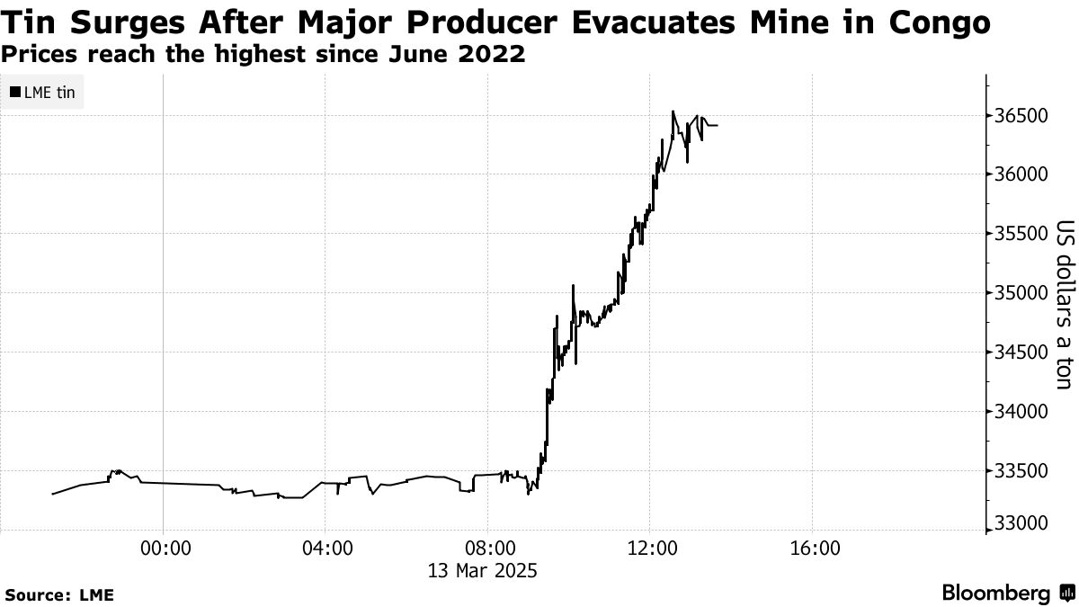 在阿尔法明资源公司宣布因反叛武装组织推进而撤离刚果民主共和国一处矿场后,锡价飙升逾9%。
