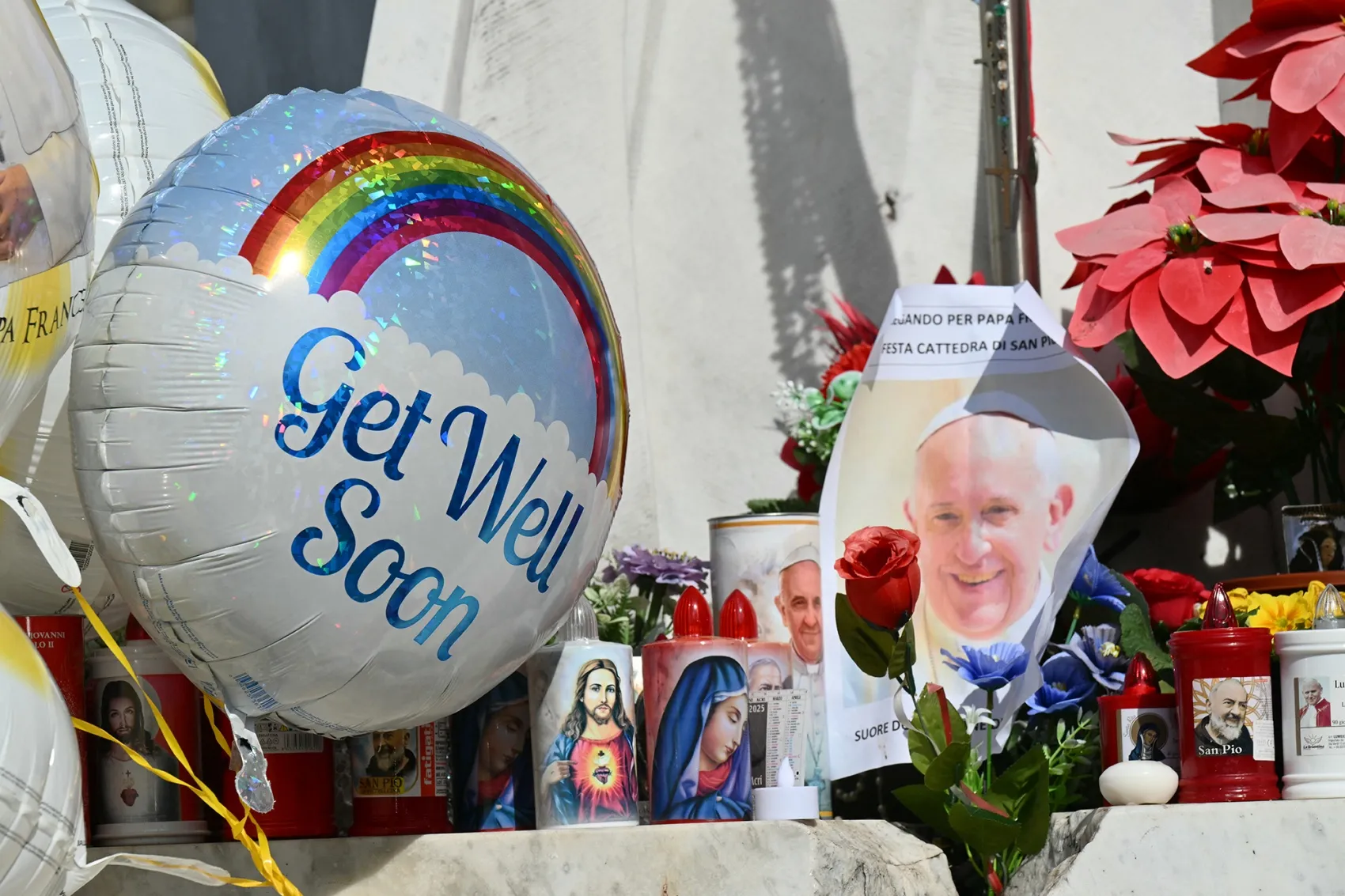 2月23日,罗马杰梅利医院外,人们前来为住院的教皇方济各祈祷,气球被系在祈祷地点。