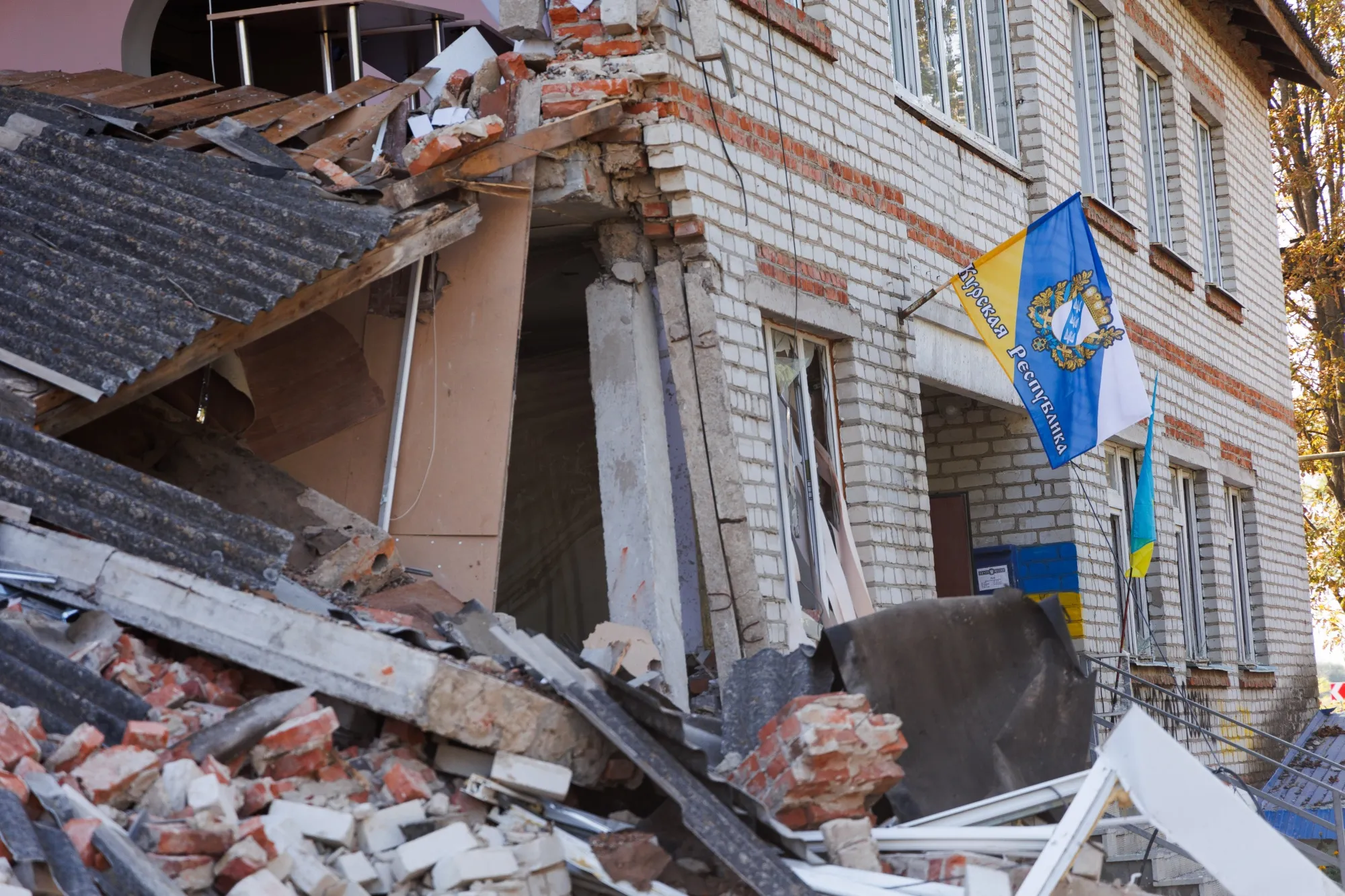 2024年9月10日,库尔斯克地区纹章旗帜悬挂在一栋受损建筑上。