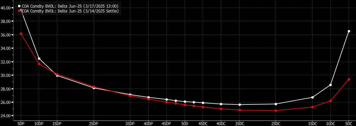这些期权价格相对低廉,每份约5美分,总赌注约100万美元——在当前期货价格接近71美元且普遍看跌的情况下堪称豪赌。6月执行价100美元的看涨期权隐含波动率跃升约7个点。这并非唯一的多头押注——稍晚时段还有价值500万桶的8月85美元看涨期权被买入。
