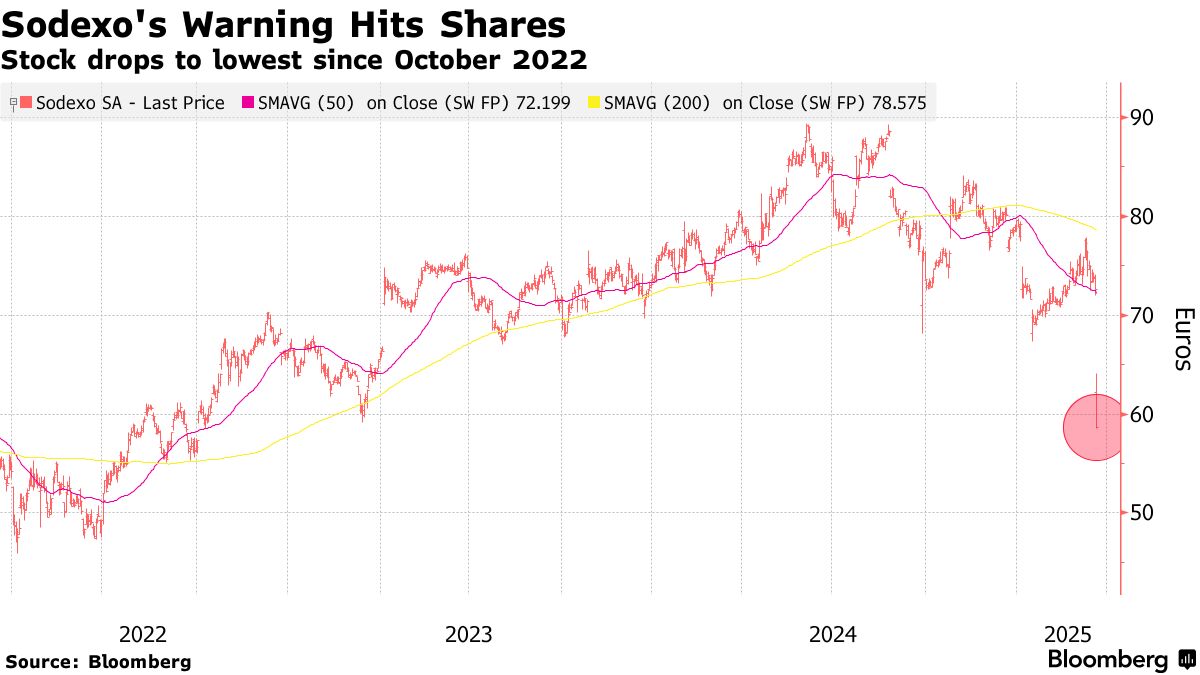 索迪斯集团股价创下近七年来最大跌幅,这家法国餐饮服务公司因美国高校业务增长放缓而下调了收入预期。