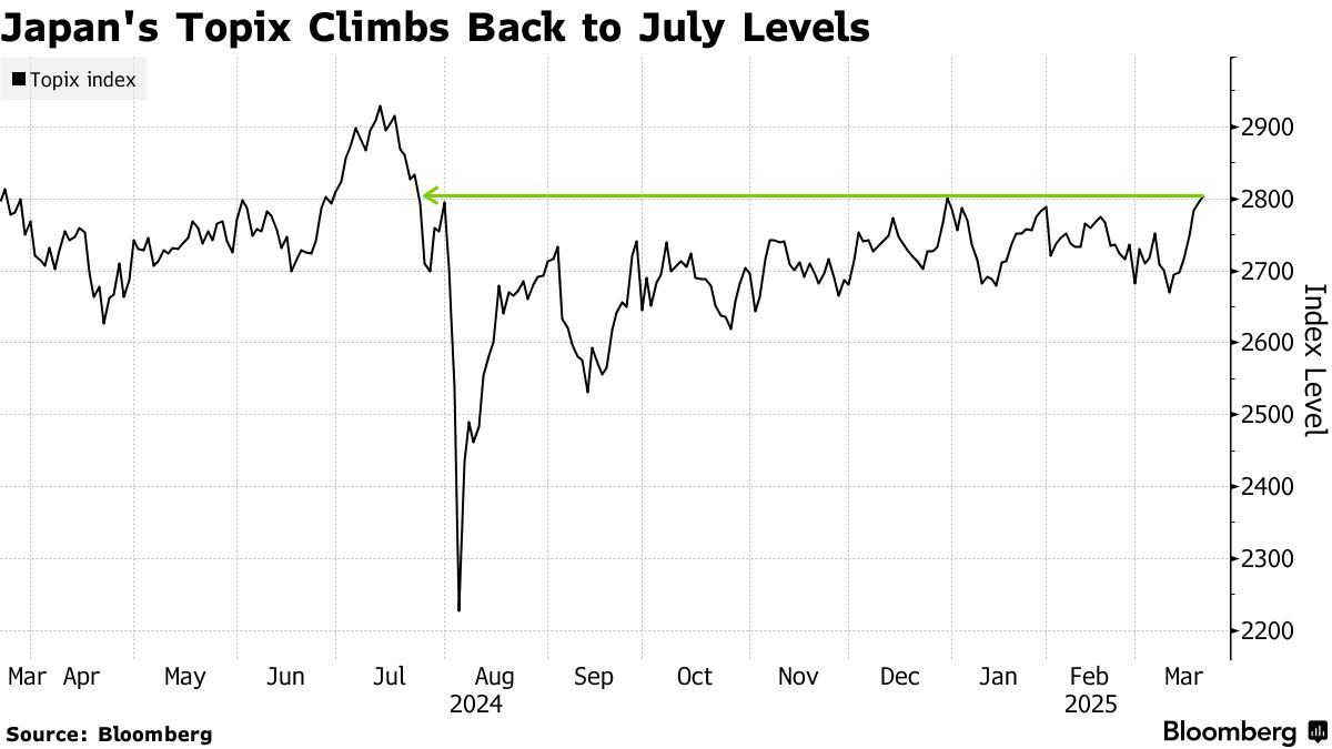 “东证指数未来可能会继续保持坚挺——它似乎没有被高估,”相泽证券的基金经理三井郁夫表示。目前对关税的担忧意味着人们将选择“价值股而非成长股,以及以内需为导向的公司而非出口商。”