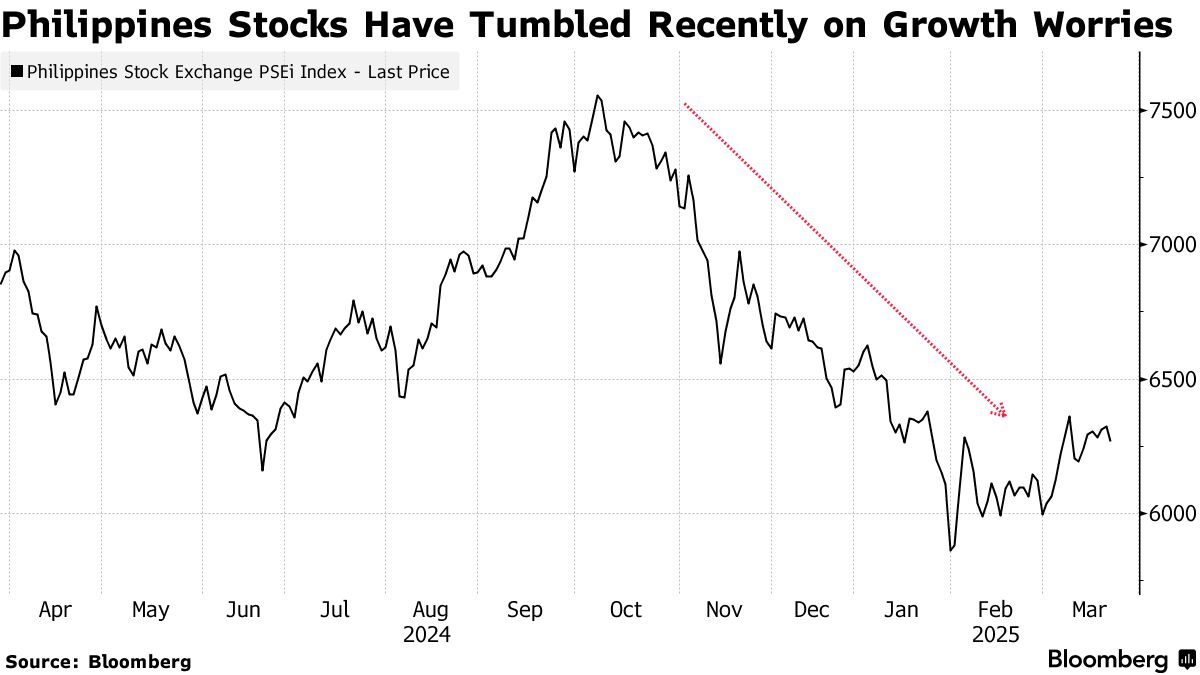 受美国市场波动等因素拖累,菲律宾基准股指今年以来下跌约5%,而MSCI亚太指数则上涨约3%。